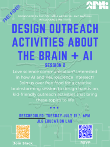 ARNI will host an informal brainstorming session on July 15th (ZI Education Lab) focused on developing AI and neuroscience/cognitive science activities for K–12 students. The goal is to create engaging ways to help young learners better understand the brain and artificial intelligence. Trainees are encouraged to attend—if you’re interested in making an impact on youth education, this is a great opportunity to get involved. Join if you are free! There will be free pizza!